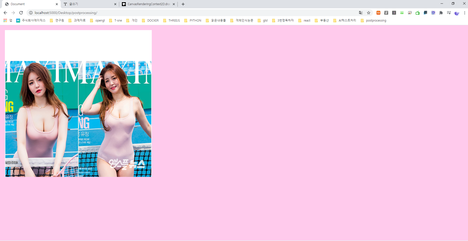 class App{ constructor(){ this.canvas = document.createElement('canvas'); this.ctx = this.canvas.getContext("2d"); document.body.appendChild(this.canvas); window.addEventListener('resize',this.resize.bind(this),false); this.resize(); this.image = new Image(); this.image.onload =this.draw.bind(this); this.image.src = "./assets/1.jpg" //requestAnimationFrame(this.animate.bind(this)); } resize(){ this.stateWidth = document.body.clientWidth; this.stateHeight = document.body.clientHeight; this.canvas.width = this.stateWidth *2 ; this.canvas.height = this.stateHeight* 2; this.ctx.scale(1,1); } animate(t){ requestAnimationFrame(this.animate.bind(this)) } draw(){ this.ctx.drawImage(this.image,10,10,300,300); } } window.onload = () =>{ new App(); }canvas를 사용할수있는 환경을 생성한후