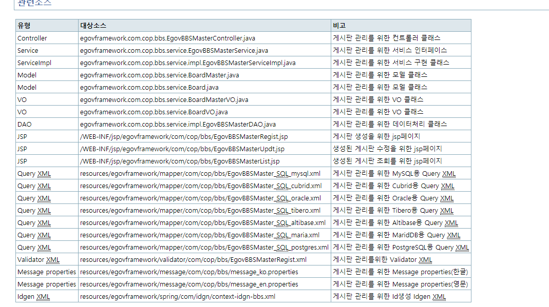 이런식으로 현재 정부프레임워크에 기능들과 각각에 컨트롤러,비즈니스 인터페이스,비즈니스 구현클래스등에 대한 정보들이 나열되어 있고 게시판 수정을 진행해가면서 참조하며 진행할것이다.