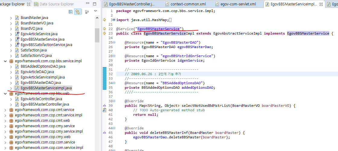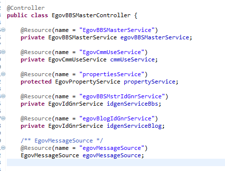 @service라고 등록한 저녀석을 가져와서 egovBBSMasterService변수에 넣는것이다. 대부분 스프링은 이런식으로