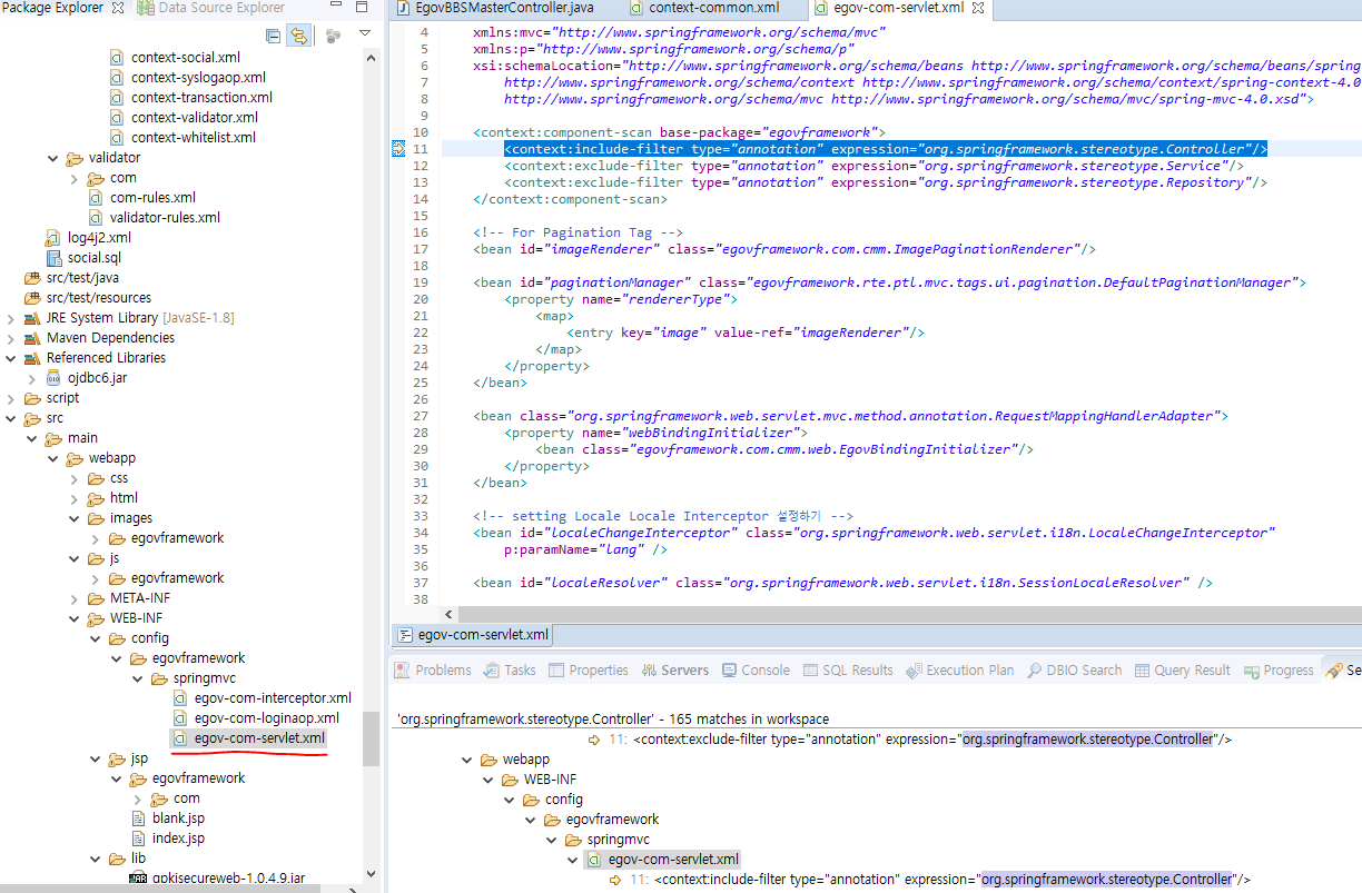 <context:component-scan base-package="egovframework">는 egovframework패키지에있는 것들을 스캔하라는 의미이고 안에 있는 <context:include-filter type="anootation" expression='org.springframework.stereotype.Controller"/>