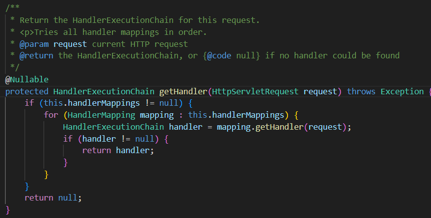 해당 메소드를 확인해보면 초기에 생성된 hadnlerMapping 객체 중에서 request를 처리할수있는 handler(Controller.메소드)를 가져오고