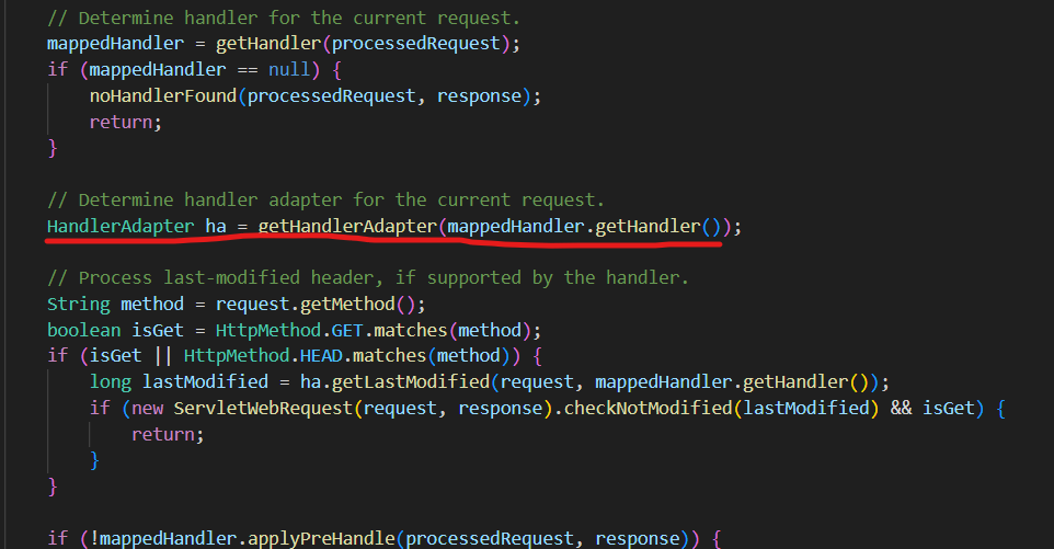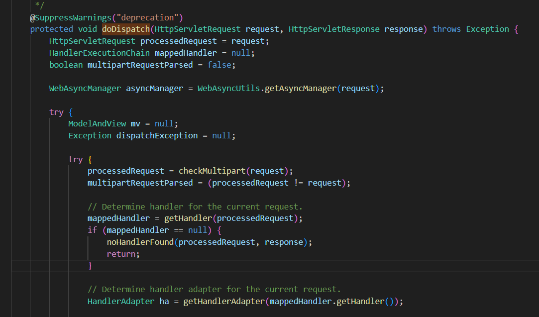 해당 DodispatchServlet 클래스의 메소드중 doDispatch 메소드가 있고, 코드를 확인하면 getHandler로 맵핑된 핸들러(컨트롤러.메소드)를 가져오는것을 볼수있다.