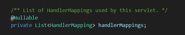 DispatcherServlet.java DIspatcherServlet은 List<HandlerMapping> 파라미터를 갖고있으며 , initHandlerMappings 메소드를 통해 HandlerMapping 정보를 초기화하고있다.