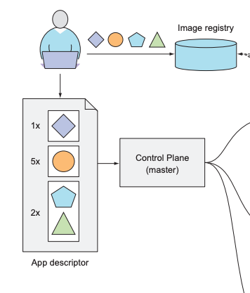 앱 디스크립터에 3개의 그룹화된 컨테이너 4개를 볼수있다 앞에 두개의 컨테이너는 각각 하나씩 그룹되어있으며, 이러한 그룹을 pod라고 부른다. 그리고 3번째 그룹화된 컨테이너에는 2개가 들어가있으며 이 2개는 함께 세트로 운영되어야 하는것을 의미한다.