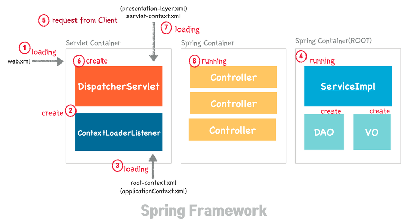 4. root-context.xml에 등록되어있는 spring container가 구동된다 이때 개발자가 작성한 비즈니스 로직에 대한 부분과 DAO,VO 객체들이 생성된다.