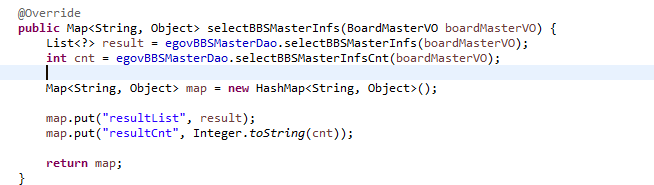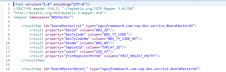 mapper는 BBSMaster라고 되어있고 select id 는 select BBSMasterList로 여기에서 sql문을 작성한뒤 리턴된값들을 VO에 저장하는 식으로 구조를 만든것같다.. 아마 모든 SI사업은 대부분이런식으로 되어있는거같다.