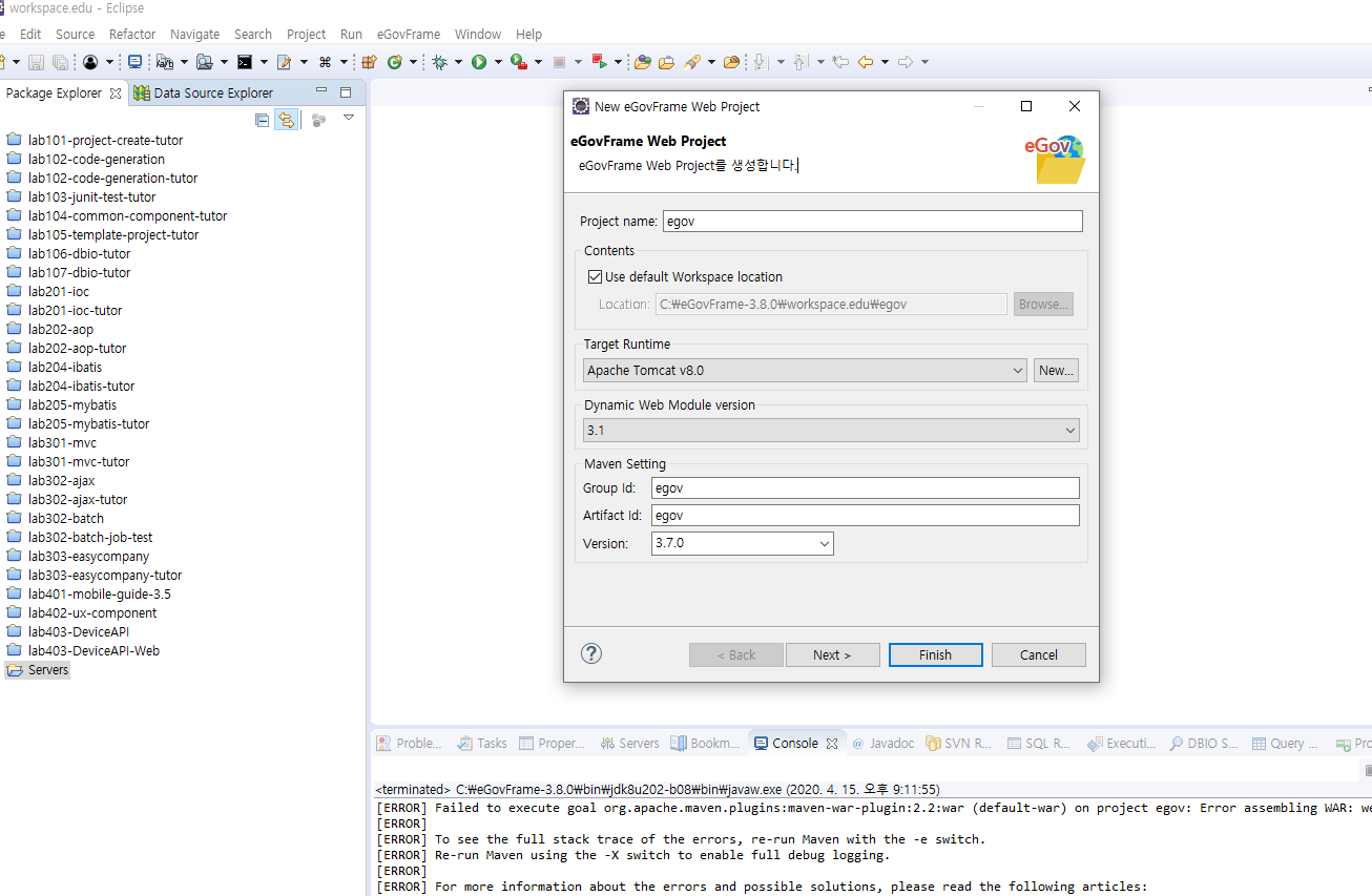 workspace.edu 폴더에 egov패키지(자신이 만든 패키지이름) 이 있을것이다