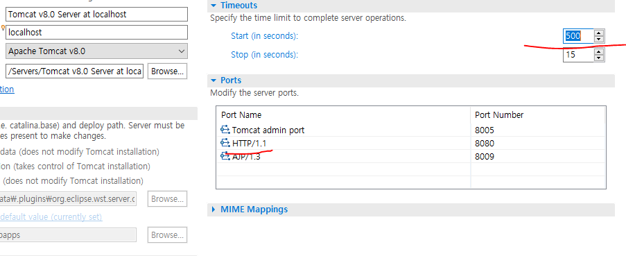 위 사진과같이 timeouts을 500으로 맞춰주고 http서버 웹서버를 8080으로 만들어주자