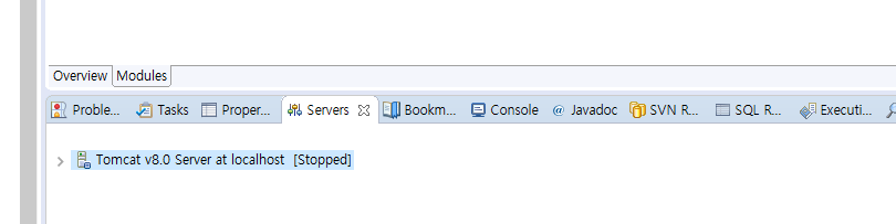 Servers 탭을 클릭(Servers 탭이 안보이면 window-> show view -> server ) Tomcat v8.0을 더블 클릭한후 modules을