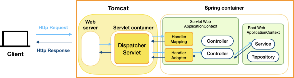 Tomcat에서 시작해 → Spring MVC 내부를 통과 → 다시 Tomcat을 통해 응답이 반환되는 전체 흐름을