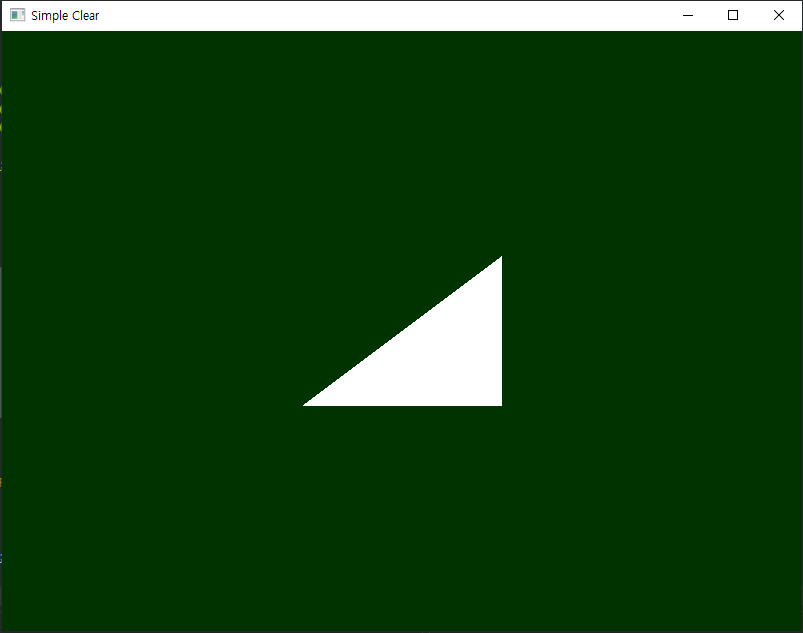 void render(double currentTime) { const GLfloat color[] ={ 0.0f , 0.2f, 0.0f,1.0f}; glClearBufferfv(GL_COLOR, 0, color); //렌더링을 위해 생성했던 프로그램 객체를 사용한다. glUseProgram(rendering_program); //점을 하나 그린다. glDrawArrays(GL_TRIANGLES, 0, 3); }