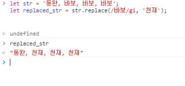 let str = '동완, 바보, 바보, 바보'; let replaced_str = str.replace(/바보/gi, '천재');짜자잔 전부다 변경된것을 확인할수있다.