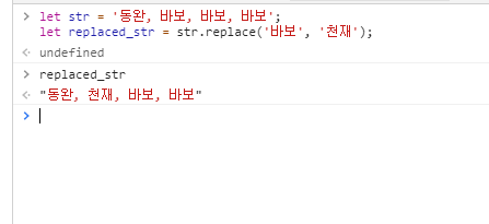 let str = '동완, 바보, 바보, 바보'; let replaced_str = str.replace('바보', '천재');위코드처럼 str.replace 를 사용하면 문자열을 바꿀수있다. 결과를 보자