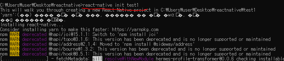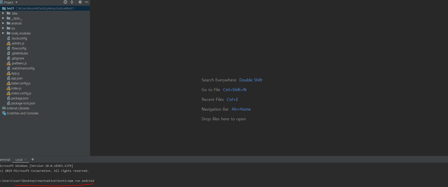 react-native init 을 통해 test1이라는 프로젝트를 실행한다.